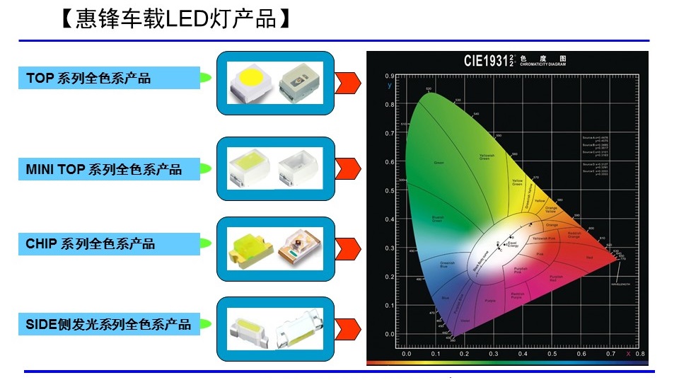 提供汽車內室應用的全色系、全尺寸、全規格、多種封裝(TOP、CHIP、MiniTOP)LED產品
